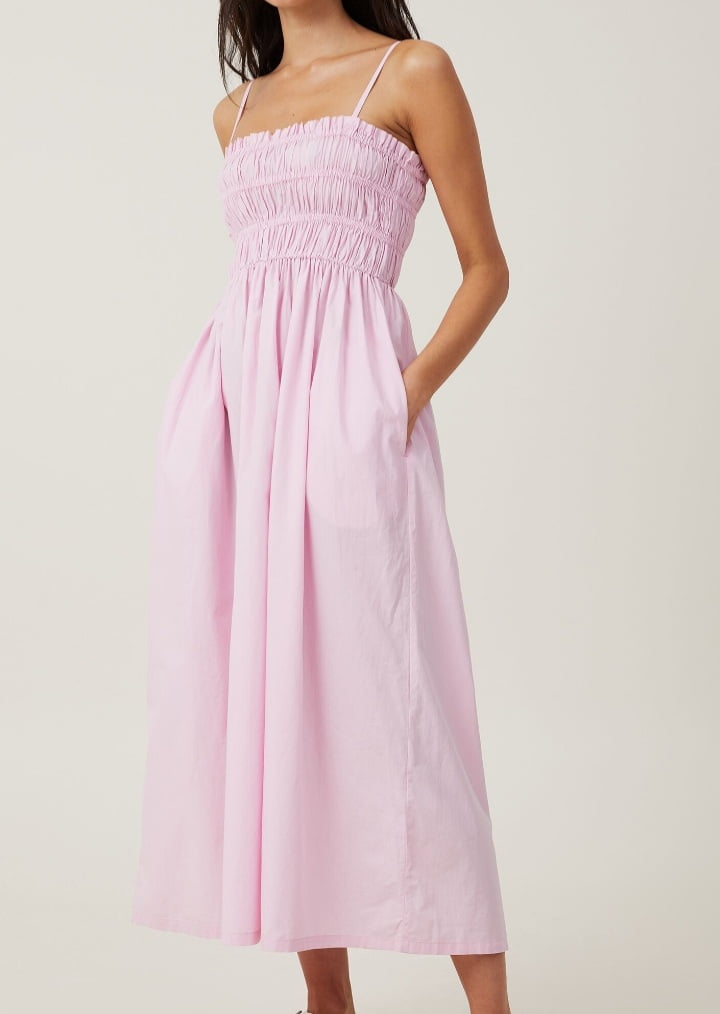 - A pale-pink Lexi Shirred Maxi Dress from Cotton On.